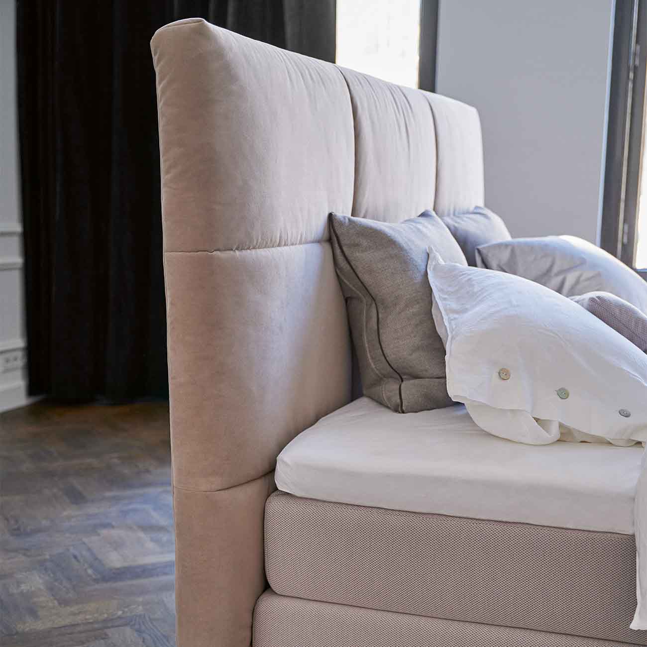 Voor de Auping Kiruna Boxspring kun u kiezen uit twee luxe hoofdborden, beide met zorg met de hand gestoffeerd in het Auping atelier in Deventer. Elk hoofdbord geeft de Kiruna zijn eigen stijl.