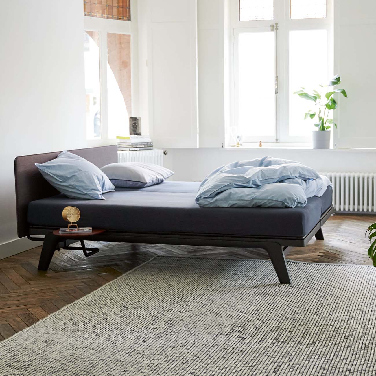 Dit bed is verkrijgbaar in verschillende formaten en is volledig aan te passen aan uw interieur. Kies uit tien stijlvolle lakkleuren voor het frame en maar liefst zeventien kleuren voor het houten tafeltje. Creëer een harmonieus geheel of ga voor een speels contrast.